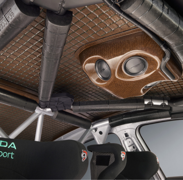 Designed as a technology demonstrator, the Enyaq RS Race is based on ampliTex and powerRibs materials developed by Bcomp. Engineers replaced sixteen components of the car with biocomposite equivalents: bumpers, wings, dashboard, door panels, footrests, roof air intake, spoiler and even the panoramic roof panel.